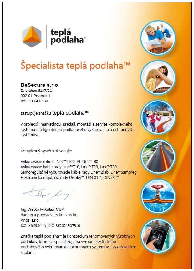 Značka teplá podlaha™ je držiteľom mnohých medzinárodných certifikátov kvality. Navyše garantujeme nadštandardné záruky pomocou nadnárodných výrobných podnikov vrátane poistenia zodpovednosti za škodu na 20 000 000 CZK (700 000 EUR).